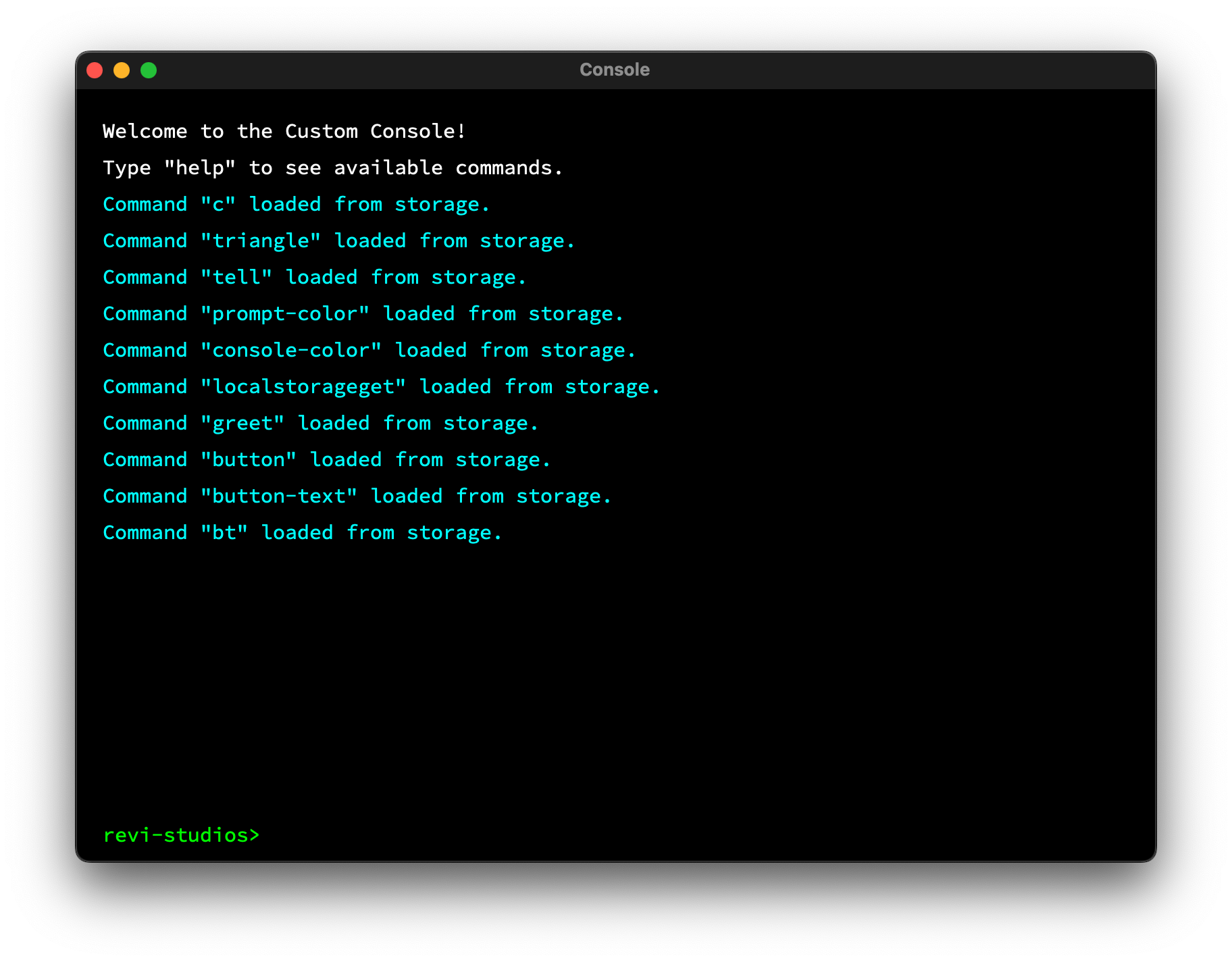 echo: Displays the text you enter clear: Clears the console cal: Performs a calculation timer: Starts a timer for a specified number of seconds store: Stores a value with a key ret: Retrieves a value using its key del: Deletes a key-value pair list: Lists all stored keys prompt: Changes the console prompt exit: Closes the console size: Sets the font size dev: Enables or disables developer mode - hide: Hides a stored value using its key - unhide: Unhides a stored value using its key - install: Installs a new command by providing its name and code - uninstall: Uninstalls a command, removing it from the available commands